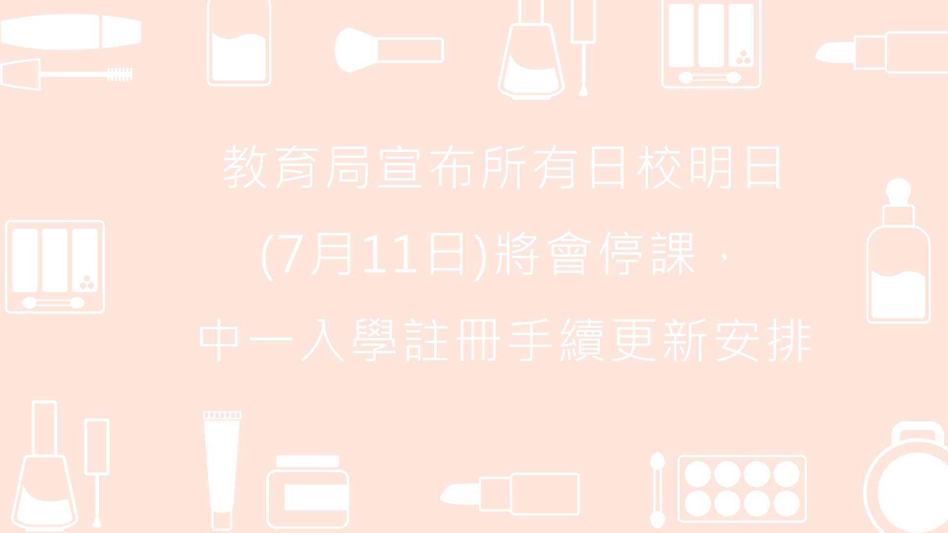 有關教育局宣布所有日校明日(7月11日)將會停課。另外,中一入學註冊手續今日(7月10日)全日的原定註冊安排將維持不變,明日辦理註冊手續的日期將改爲下星期一(7月14日)。